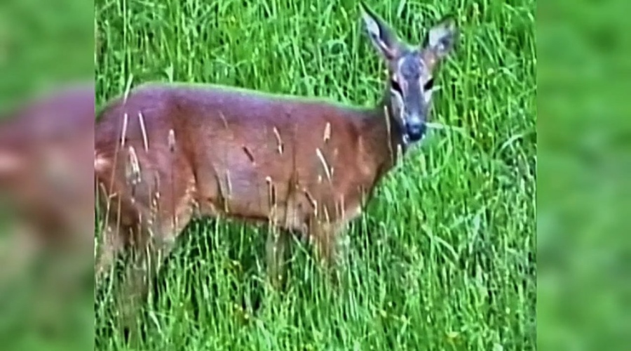 mehrere Rehe zur Äsung auf der Wiese. Eine scheinbar ältere Ricke mit