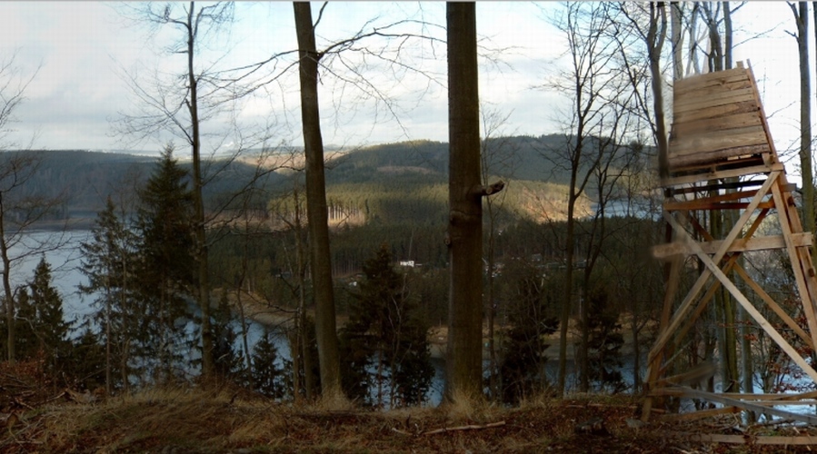 stand eine geschlossene Kanzel oberhalb eines Hanges im Altholz, die