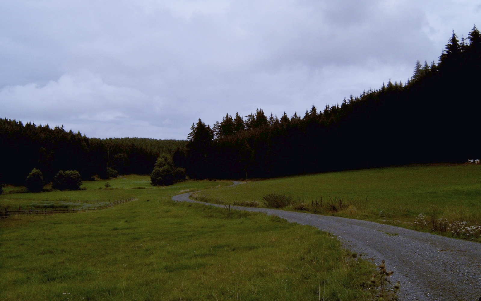 Ferne. Die linksseitige baumlose Fläche führt in leichtem Bogen zu uns