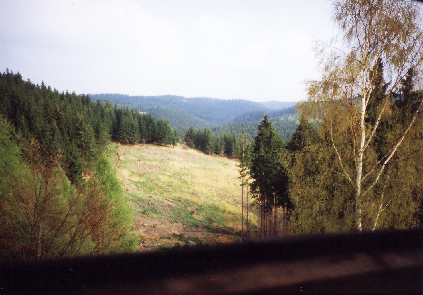 die Kanzel befindet. Ich schaue über grüne Hügel bis weit in die