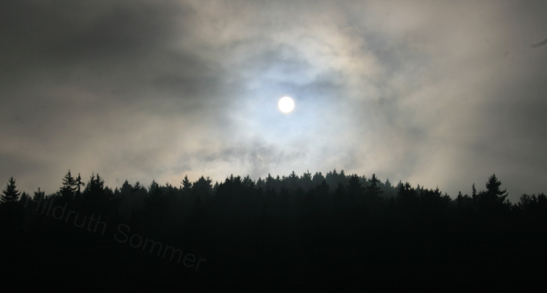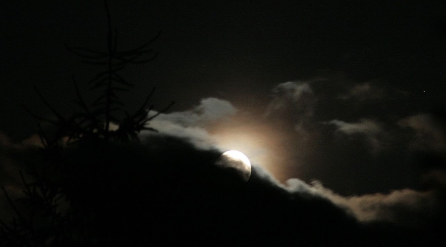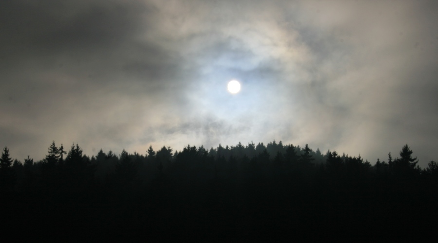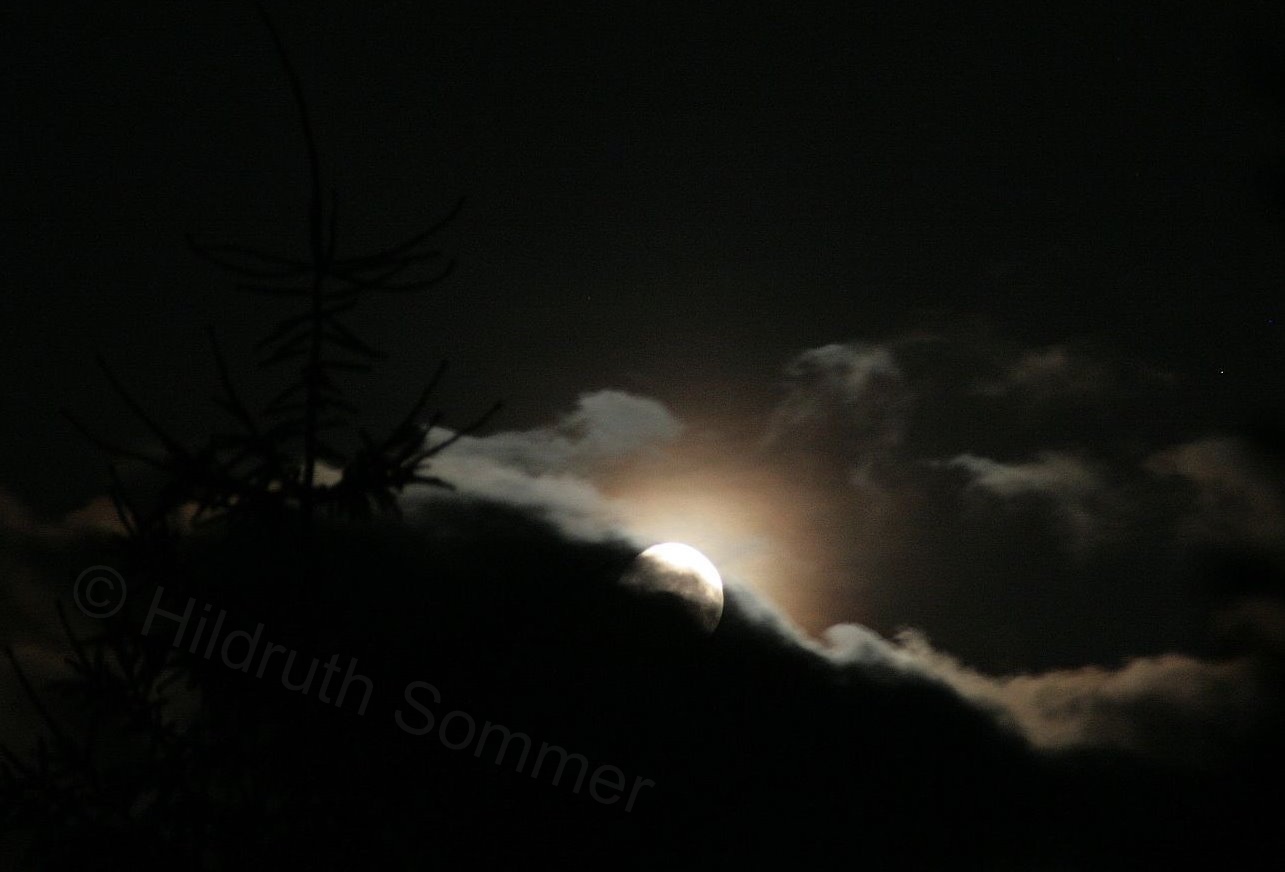 mehr mit. Der Mond hält sich hinter Nebelwolken versteckt. Nur hin und